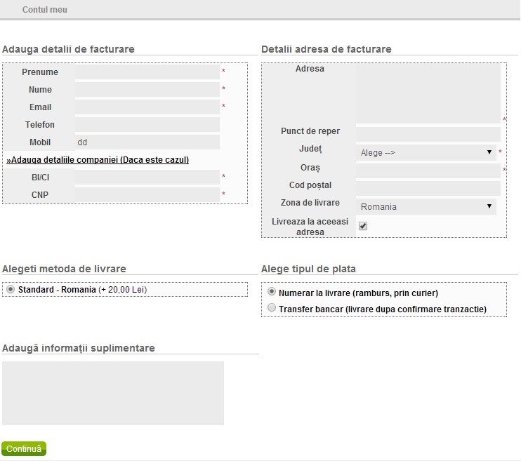 După ce ați ales produsele, completați detaliile privind livrarea comenzii, selectând Continuă (dacă dorești să îți faci cont) sau Trimite comandă fără să te înregistrezi dacă nu dorești cont, în partea de jos a paginii, sub "Coșul de cumparaturi". Dureaza maxim 1-2 minute.
