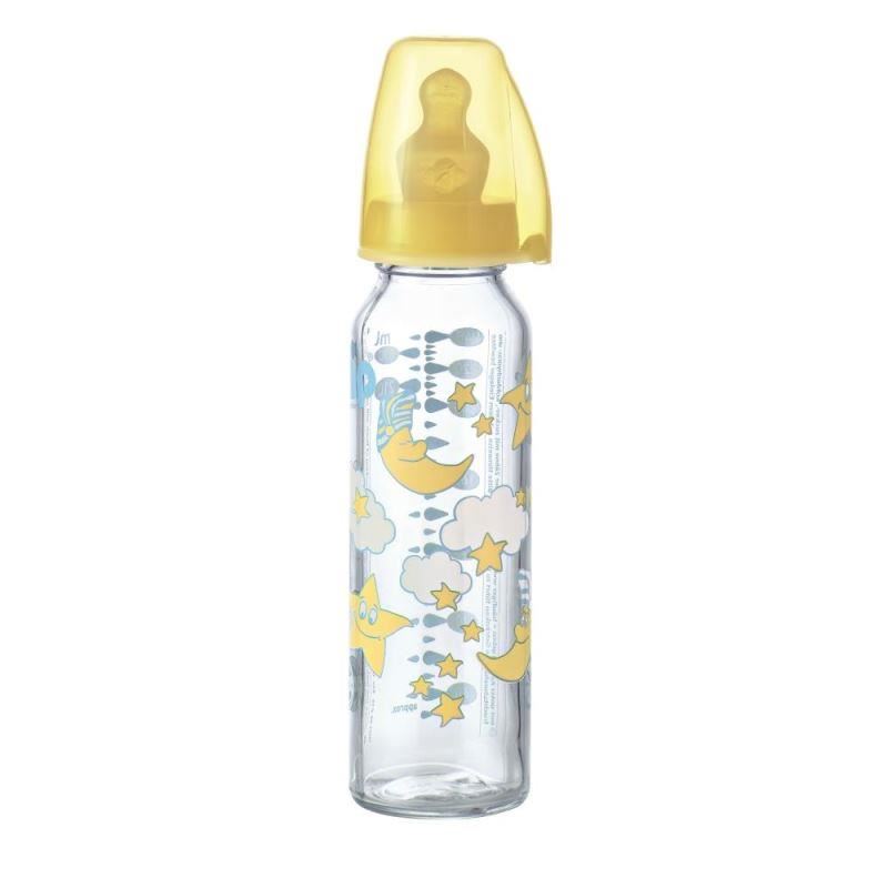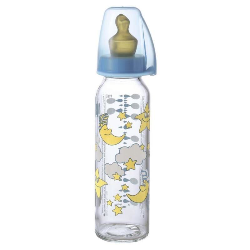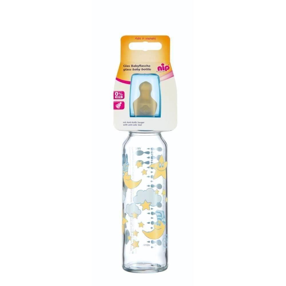 Biberon nip din sticla 250 ml cu tetina latex ortodontica ventilata pt lapte (M), marimea 1 (0-6 luni)