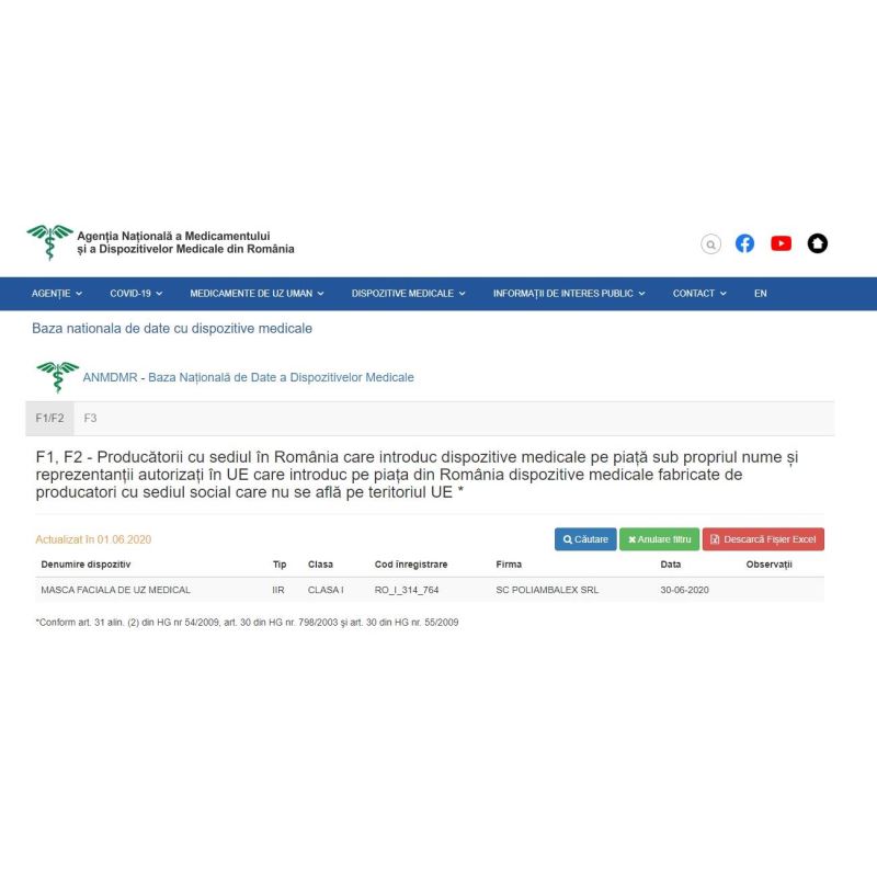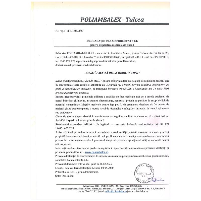 - Mastile faciale MC01 indeplinesc conditiile de clasificare ca dispozitiv medical clasa I. Aceste dispozitive au fost supuse evaluarii conformitatii potrivit prevederilor Directivei Europene 93/42/CEE si poarta marcajul european de conformitate CE.